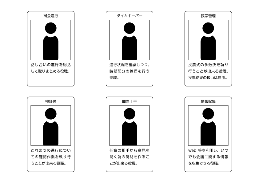 ・各参加者に話し合いの進行に関する役職をランダムで振り分ける