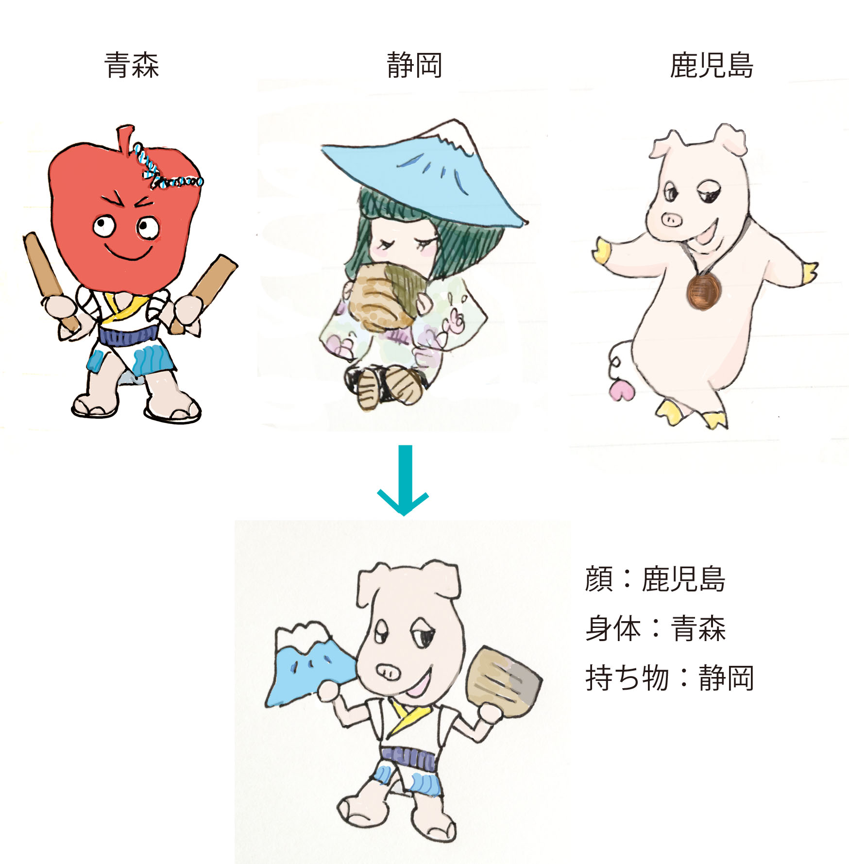 例)青森県生まれで 静岡の大学に行き 鹿児島に初めて旅行した思い出がある人が作るオリジナルキャラクター