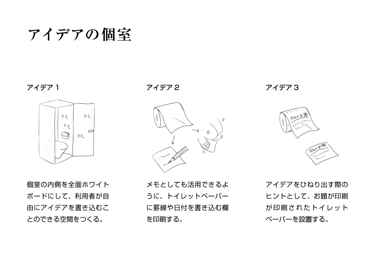 B5 大澤信哉家庭でも使える製品としての提案よりは、インスタレーション寄りの提案の方がメッセージ性を持たせることができると思った。日常生活中のアイデアをひねり出す場としてトイレを提案し、利用時の意識に変化をもたらすことを目的とする。簡易設置式洋式トイレhttp://www.top.arc-eshop.jp/shop/item_detail?category_id=92282&item_id=323214[0回]PR 2013年 05月 27日| 大澤|Comment(0)