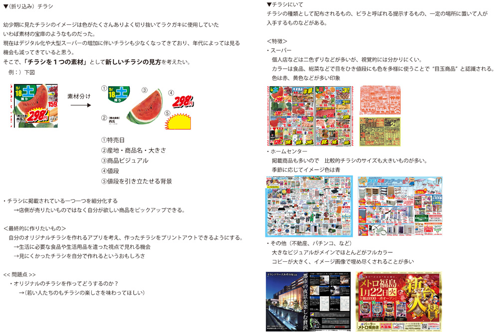 スーパー、ドラッグストア、ホームセンター等のチラシはデジタル化が進んでもいまだに紙媒体が主となっている。地方によって異なるチラシの研究を行い、色や文字、コピーなどの多数の情報が入っているチラシを素材として扱う。