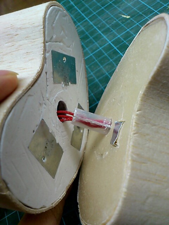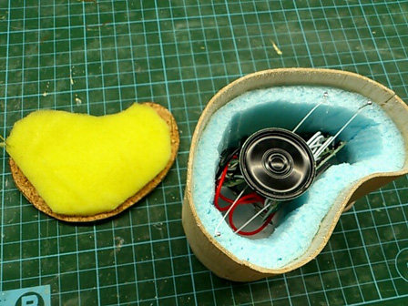肝心の音部分ですが、スピーカーが他になるべく接触しないようテグスに乗せスポンジで軽く固定しています。バルサで蓋をすると以前よりきれいに響いてくる音もあったので、音源自体の音量レベルをいじったりでかなり安定するのではないかと。(そこまで出来ませんでした…)