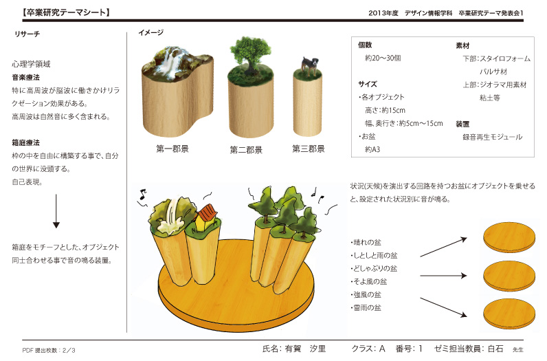 A1 有賀(テーマシート)提出用の一応完成版です。(チェック入れ忘れてますがアップロード版には入れておきます)月曜日の面談後、構造について考えた結果やや加工しにくい感じになってしまいました。円の溝もスタイロフォームで掘って、(スイッチ部分なので)金属テープで張り合わせでいけますかね…?凹凸の形はこれ以外も考えましたが、やはり向きに自由を与えるとこれしか無いと思います。要試作かと。[1回] 2013年 07月 12日| 有賀|Comment(0)